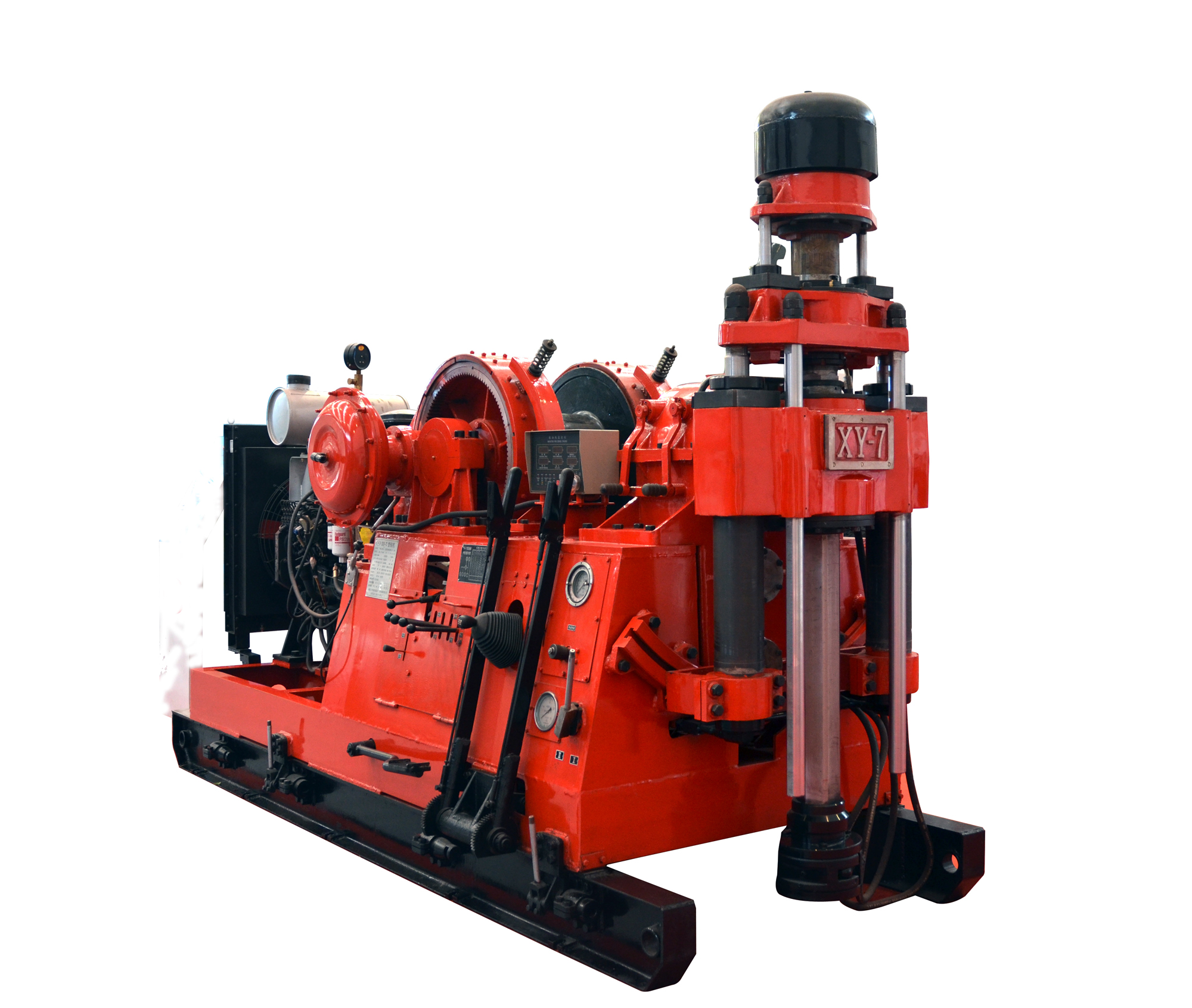 XY-7型鉆機是我公司新研發(fā)的機械傳動液壓給進立軸式巖心鉆機,主要用于金屬、非金屬固體礦床勘探及金鋼石小口徑鉆進,亦可用于大口徑合金鉆進;可鉆垂直孔和傾斜孔,也可用于水文、油氣田的勘探及工程鉆孔。XY-7型鉆機的研制,填補了我公司立軸式巖芯鉆機2500米左右深孔鉆孔空白,完善了我公司立軸式巖心鉆機的系列化,方便用戶選擇。